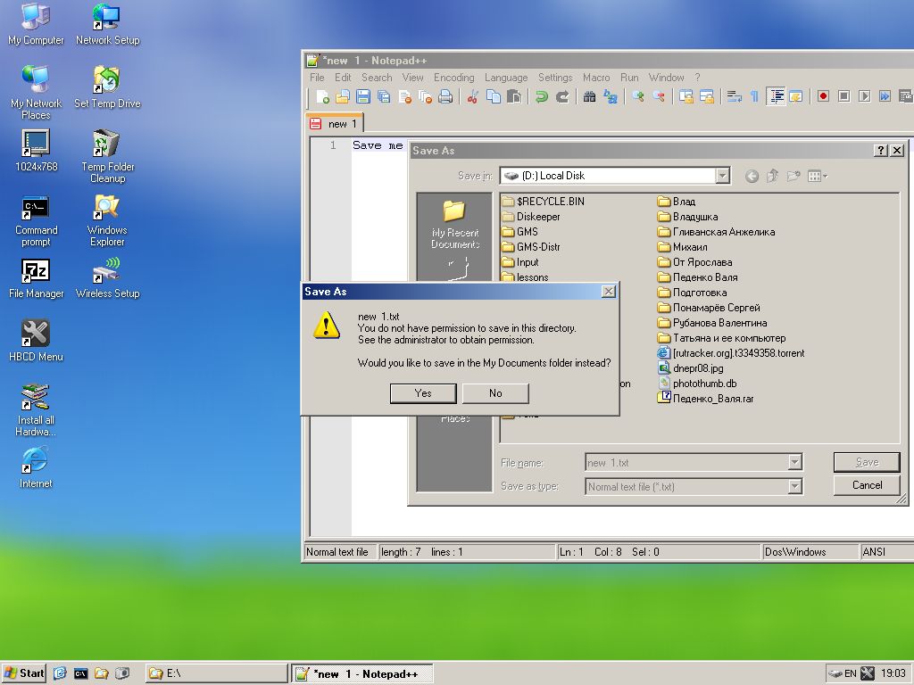 16.12.2012 в 21:46Да ради всего святого, я вам искренне верю что вы занимались ноутами и запароленными учетками , а на счет венды вы не правы, имей она даже такой эффект ей бы так же пользовались бы как и сейчас и между прочем такого рода трабла когда люди после переустановки не имеют доступа к своим данным так как ранее шаловливыми ручками что-то настроили имеет место быть и с этим приходится как-то справляться, далее, вы простите, но явен один факт, вам просто не приходилось смотреть на нюансы. То что учетка запоролена это совершенно не означает что кто-то занимался администированием данной машины и не значит что на ней были применены разного рода политики, в таких юзерских ноутах в правах доступа к файлам есть "все", так же на машине явно не объявлен "хозяин" и не настроены сетевые политики с определенным уровнем доступа к сетевым ресурсам. Таким образом выдернув винт из такой машины где пользователь лишь защитил свой экран входа, но не доступ к данным, и подключив его к другой машине с админ правами все будет тип-топ. Но дабы много не писать, у меня дома стоит ограничение на запись одного из винчестеров, линукса нет и лень грузить, есть вот Hirens's Boot 15.1 под рукой, загружаю MiniXP, альтернативная ОС, у меня на борту семерка ультимейт, загрузился как админ естественно, создаю файл на диске где ограничивал доступа, смотри скрин шот: